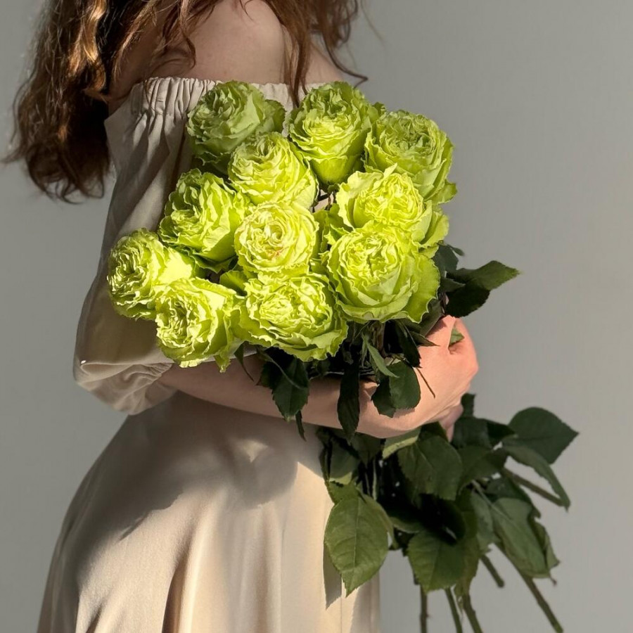 На фото букет из 11 зеленых роз. В составе: пионовидная роза 11 шт, атласная лента 1 шт, . Все цветы свежие и ароматные, букет красиво оформлен и отлично подходит для подарка. Доступна доставка цветов или самовывоз.