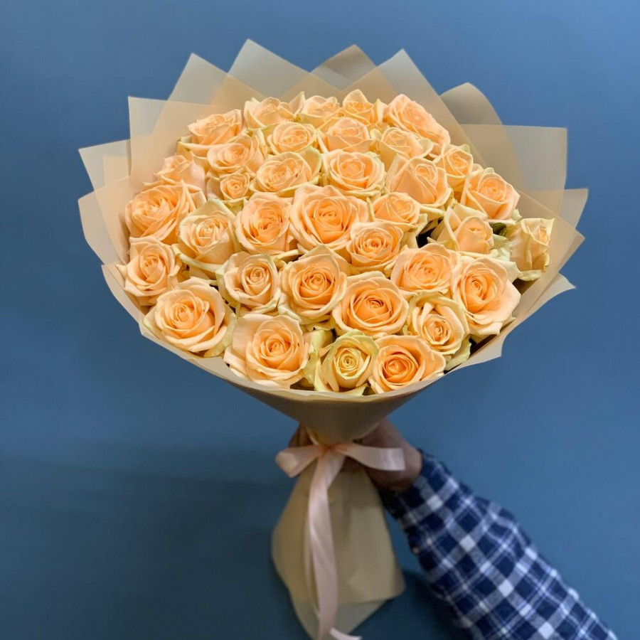 На фото букет из 35 кремовых роз. В составе: роза 35 шт, дизайнерская упаковка 2 шт, атласная лента 1 шт, . Все цветы свежие и ароматные, букет красиво оформлен и отлично подходит для подарка. Доступна доставка цветов или самовывоз.