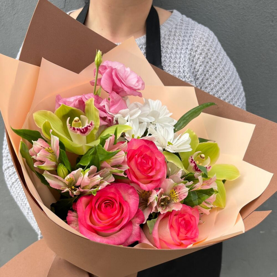 На фото букет «гармония орхидей». В составе: альстромерия 2 шт, орхидея 2 шт, роза 3 шт, хризантема кустовая 1 шт, эустома (лизиантус) 1 шт, дизайнерская упаковка 1 шт, атласная лента 1 шт, . Все цветы свежие и ароматные, букет красиво оформлен и отлично подходит для подарка. Доступна доставка цветов или самовывоз.